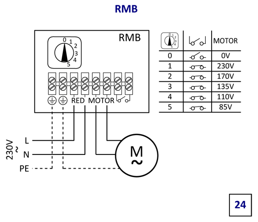 • RMB - jednofazowy (230 V / 50 Hz), pięciostopniowy regulator transformatorowy (80 V, 105 V, 130 V, 160 V, 230V).
